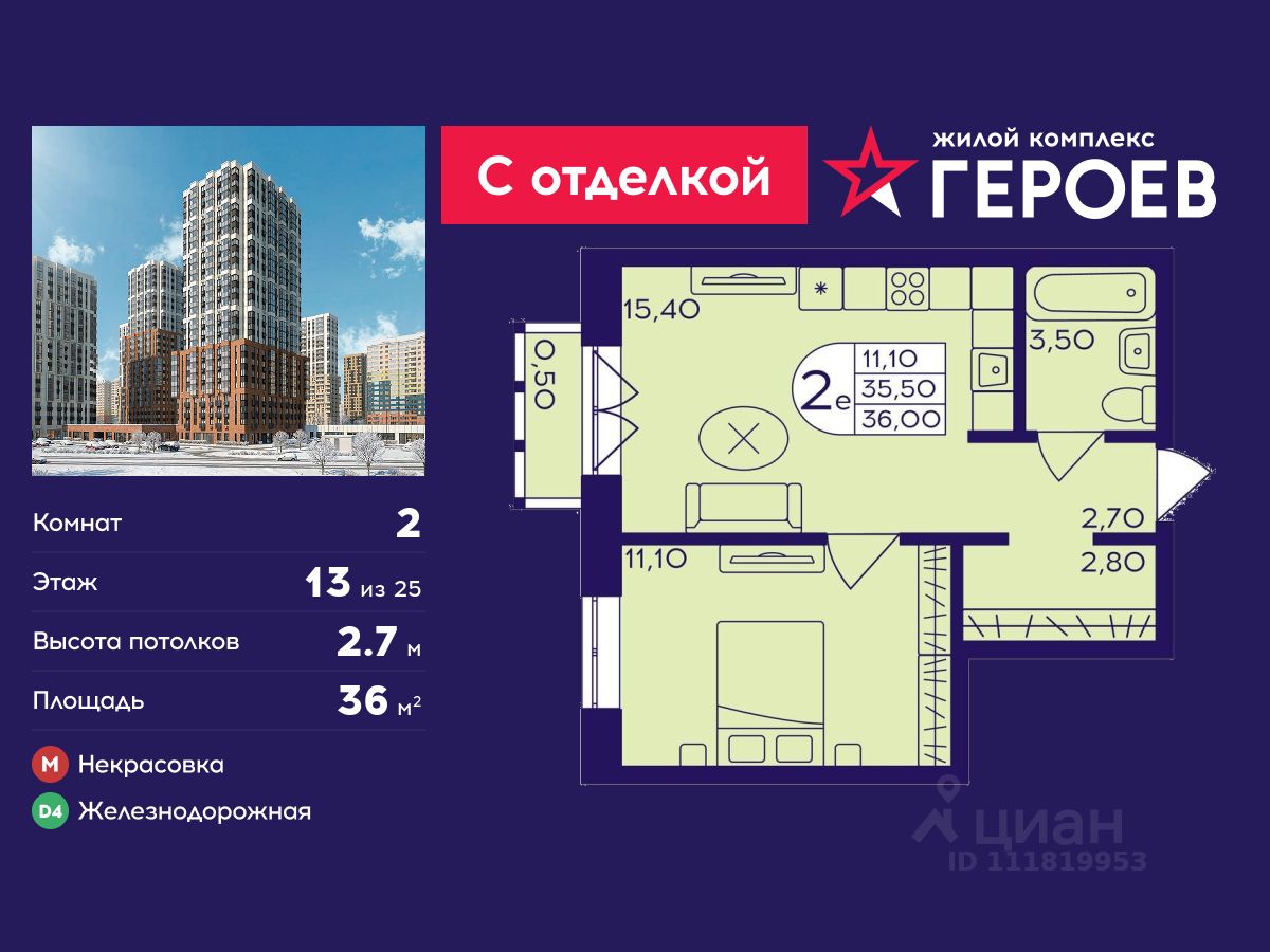 Продаётся 2-комнатная квартира 36 кв. м. в жилом комплексе "Героев" в Балашихе, Железнодорожный. Квартира расположена на 13 этаже 611 корпуса.
