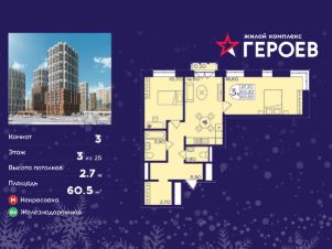 Продаётся 3-комнатная квартира в формате евро 60.50 кв. м. в жилом комплексе "Героев" в Балашихе, Железнодорожный. Квартира расположена на 3 этаже 611 корпуса.