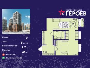 Продаётся 2-комнатная квартира в формате евро 41.00 кв. м. в жилом комплексе "Героев" в Балашихе, Железнодорожный. Квартира расположена на 3 этаже 611 корпуса.