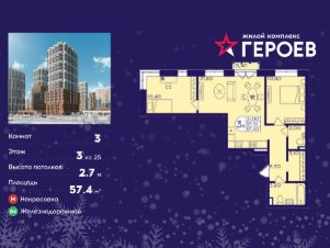 Продаётся 3-комнатная квартира в формате евро 57.40 кв. м. в жилом комплексе "Героев" в Балашихе, Железнодорожный. Квартира расположена на 3 этаже 611 корпуса.