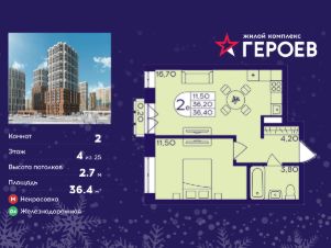 Продаётся 2-комнатная квартира в формате евро 36.40 кв. м. в жилом комплексе "Героев" в Балашихе, Железнодорожный. Квартира расположена на 4 этаже 611 корпуса.