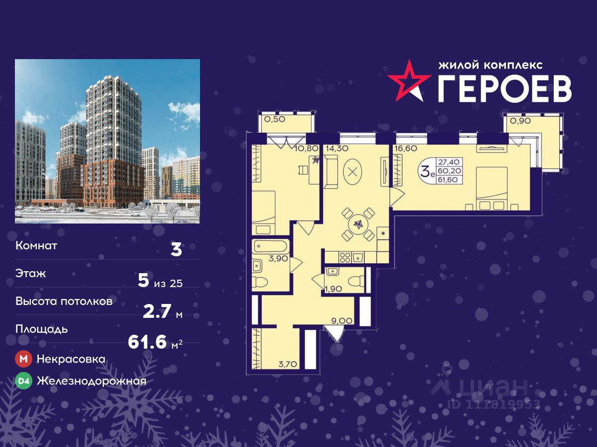 Продаётся 3-комнатная квартира в формате евро 61.60 кв. м. в жилом комплексе "Героев" в Балашихе, Железнодорожный. Квартира расположена на 5 этаже 611 корпуса.