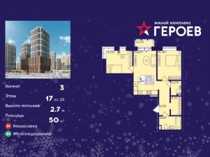 Продаётся 3-комнатная квартира в формате евро 50.00 кв. м. в жилом комплексе "Героев" в Балашихе, Железнодорожный. Квартира расположена на 17 этаже 611 корпуса.