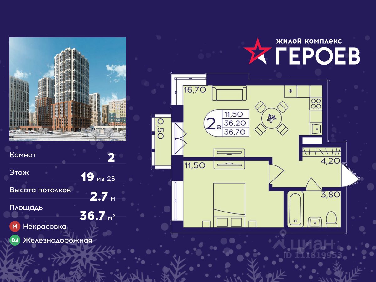 Продаётся 2-комнатная квартира в формате евро 36.70 кв. м. в жилом комплексе "Героев" в Балашихе, Железнодорожный. Квартира расположена на 19 этаже 611 корпуса.