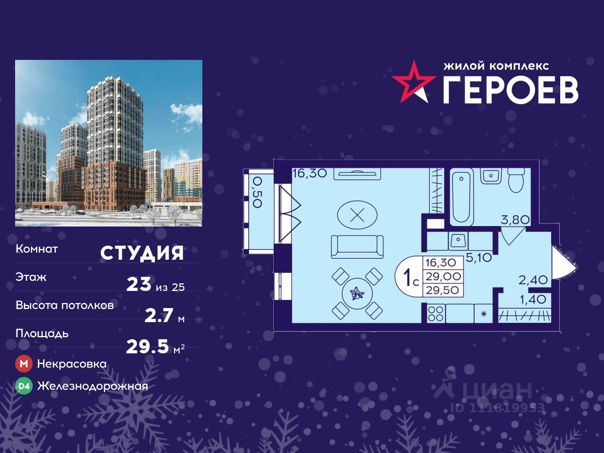 Продаётся студия 29.50 кв. м. в жилом комплексе "Героев" в Балашихе, Железнодорожный. Квартира расположена на 23 этаже 611 корпуса.