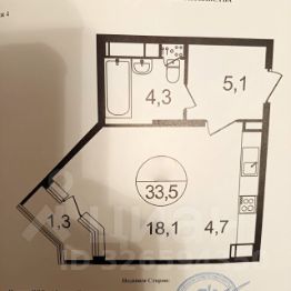 Комната - 18,1 кв. м., кухня - 4,7 кв. м., ванная - 4,3 кв.м., прихожая - 5,1 кв.м.