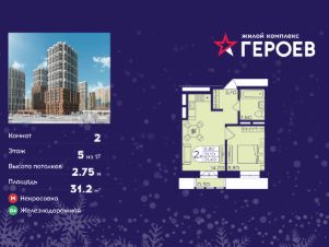 Продаётся 2-комнатная квартира в формате евро 31.20 кв. м. в жилом комплексе "Героев" в Балашихе, Железнодорожный. Квартира расположена на 5 этаже 407 корпуса.