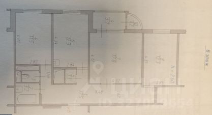 Две изолированные спальни по 13 кв. м, гостиная 17,8 кв. м, кухня 11,5 кв. м с кухонным гарнитуром и бытовой техникой. Окна выходят во двор.