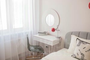 Спальня: Кровать с ортопедическим матрасом и подъемным механизмом, тумбы, рабочее место.
