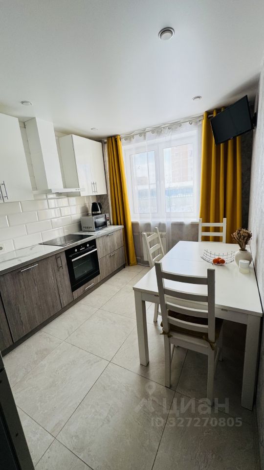 • На кухне плитка большого формата, встроенный кухонный гарнитур, варочная панель, духовой шкаф, вытяжка, стиральная машинка, обеденная зона у окна.