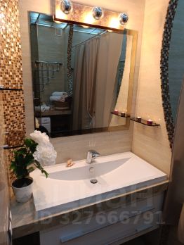 Интерьер оформлен в современном стиле,с применением натурального камня травертин и мрамора.На стенах венецианская штукатурка. Большая кухня-гостинная оснащена всей необходимой бытовой техникой премиум класса. В оформлении квартиры принимали участие дизайнеры и художники.