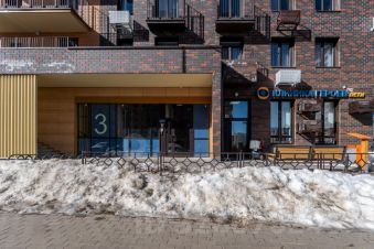 Входная группа современного образца на уровне земли со сквозными входами со стороны двора и улицы. На первых этажах с высокими потолками располагаются колясочные, стойки для хранения велосипедов и лифтовые холлы.