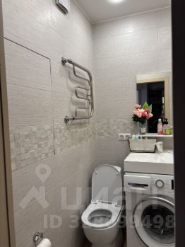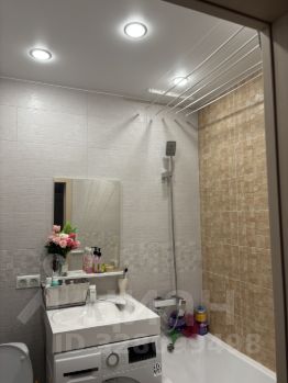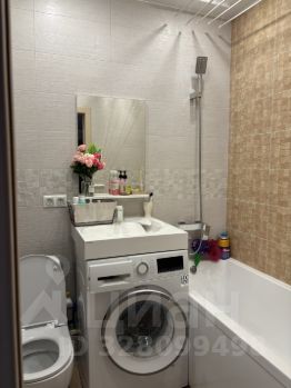 Санузел объединен, интересная необычная раковина, под которой находится встроенная стиральная машина. Комната уютная светлая в спокойных тонах, с кондиционером, место позволяет сделать гардеробную.