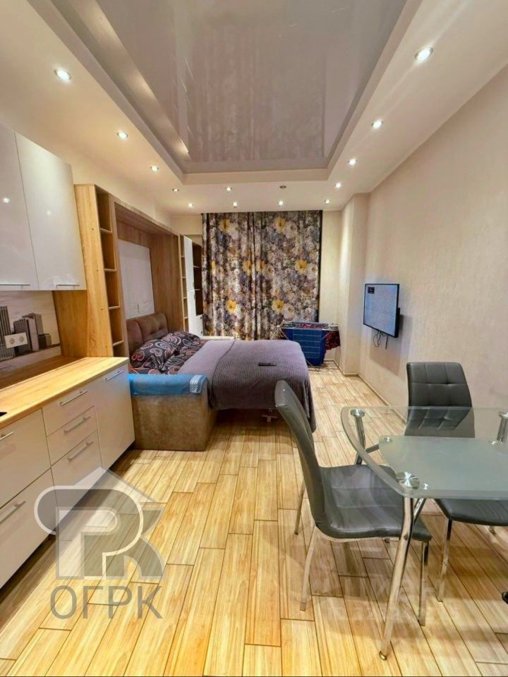 Студия - апартаменты, с качественным дизайнерским ремонтом полностью оборудована для проживания. Санузел отделан плиткой, оборудован душевой кабиной, стиральной машинкой. Качественная мебель и техника, кухня со встроенной варочной поверхностью, круглый кухонный стол - всё в отличном состоянии и достаётся новому собственнику.