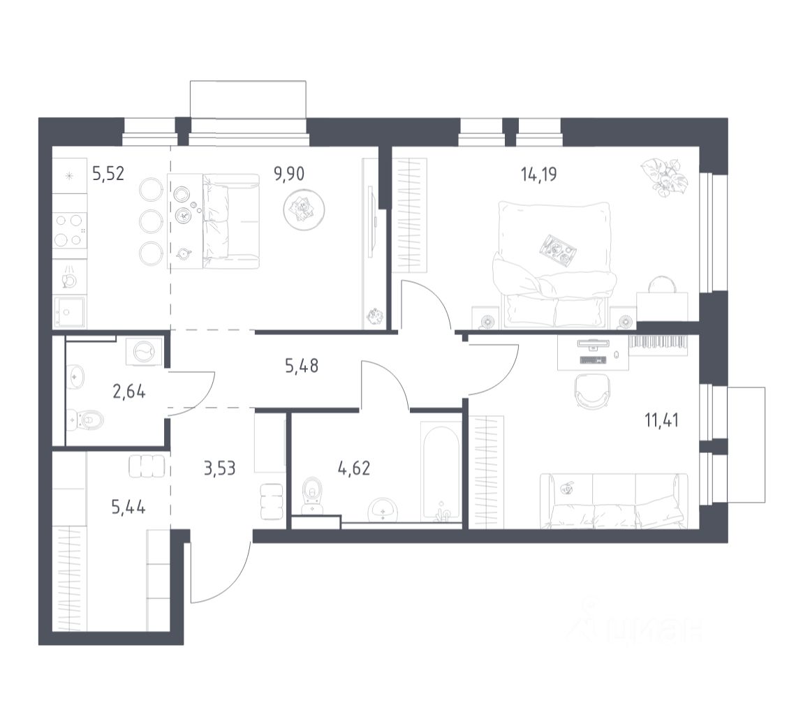 Квартиры комплекса — на выбор: могут быть как с отделкой, так и без. В случае с готовой отделкой в комнатах и прихожей уже будут обои, натяжные потолки и ламинат, а в санузлах — керамогранит на полу и керамическая плитка на стенах. Мы подведем все коммуникации и установим сантехнику.