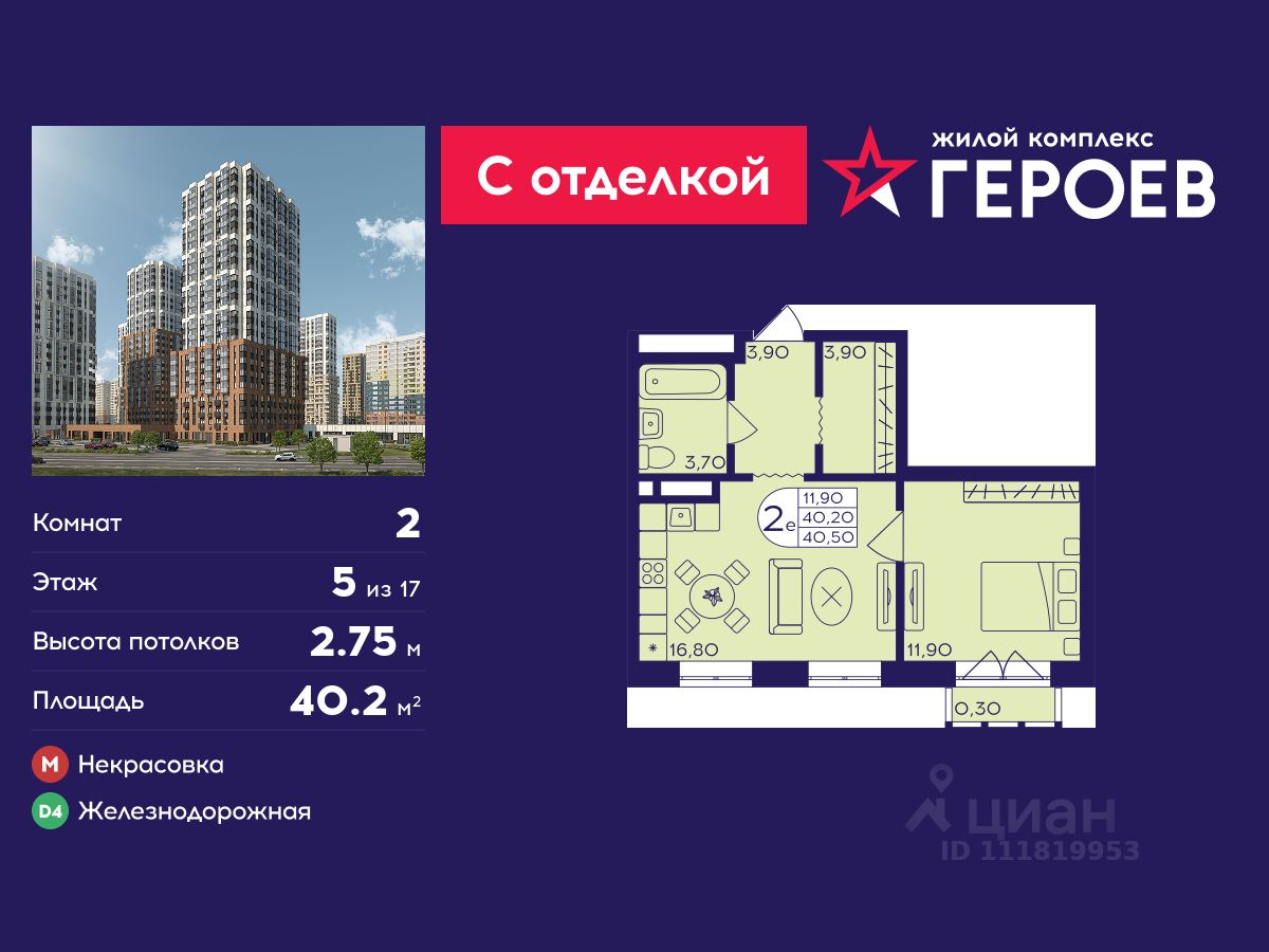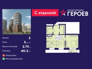 Продаётся 2-комнатная квартира 40.2 кв. м. в жилом комплексе "Героев" в Балашихе, Железнодорожный. Квартира расположена на 5 этаже 408 корпуса.