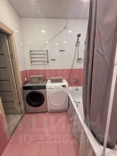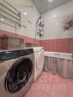 Аккуратный совмещенный санузел с сантехникой и стиральной машиной.