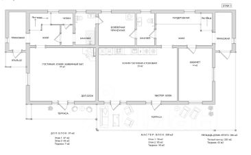Первый этаж: гостиная с выходом на террасу, кухня-столовая с выходом на террасу, кабинет, 2 санузла, котельная-постирочная.