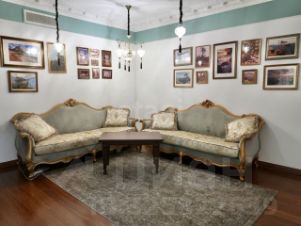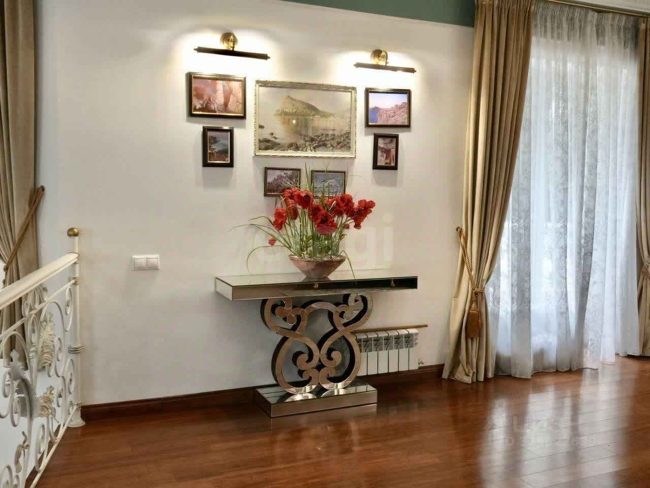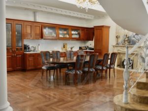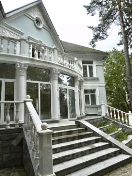 Главный дом площадью 450 кв. м выполнен из натуральных материалов — камня и дерева. На первом этаже расположены холл, кухня, две спальни и санузел, выход на просторную веранду с теплым полом. Второй этаж полностью отведен под приватную зону: мастер-спальня с гардеробной и ванной, а также кабинет с панорамным остеклением. В цокольном этаже оборудованы постирочная, санузел для персонала, гардеробные, кладовые и технические помещения.