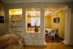 Толстые стены и ж/б перекрытия глушат звуки, поэтому вечер в гостиной не мешает отдыху наверху.